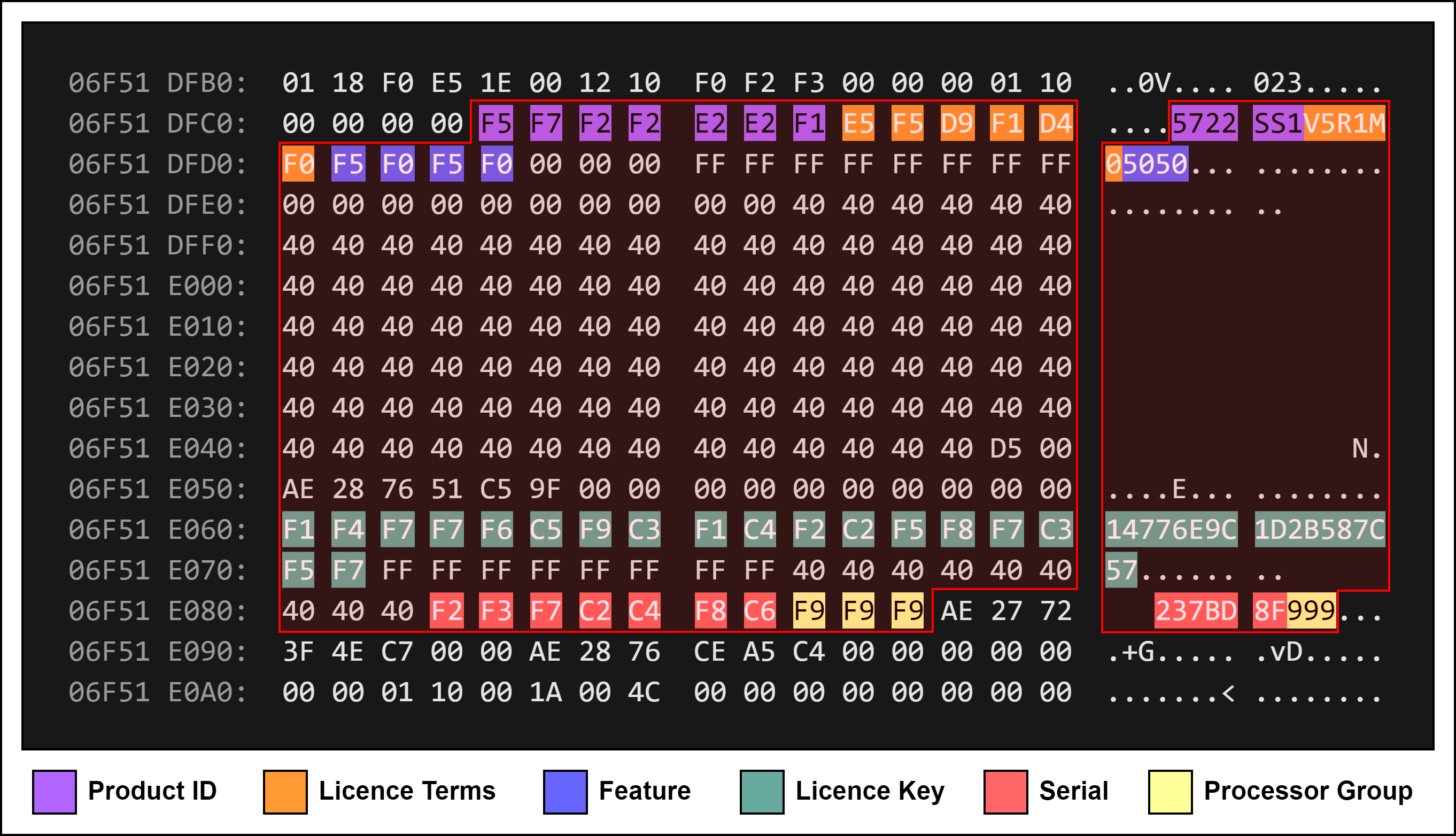 Nous pouvons colorer les différentes sections de cette structure LICENCEINFO2 afin de mieux mettre en évidence les données qu’elle contient.