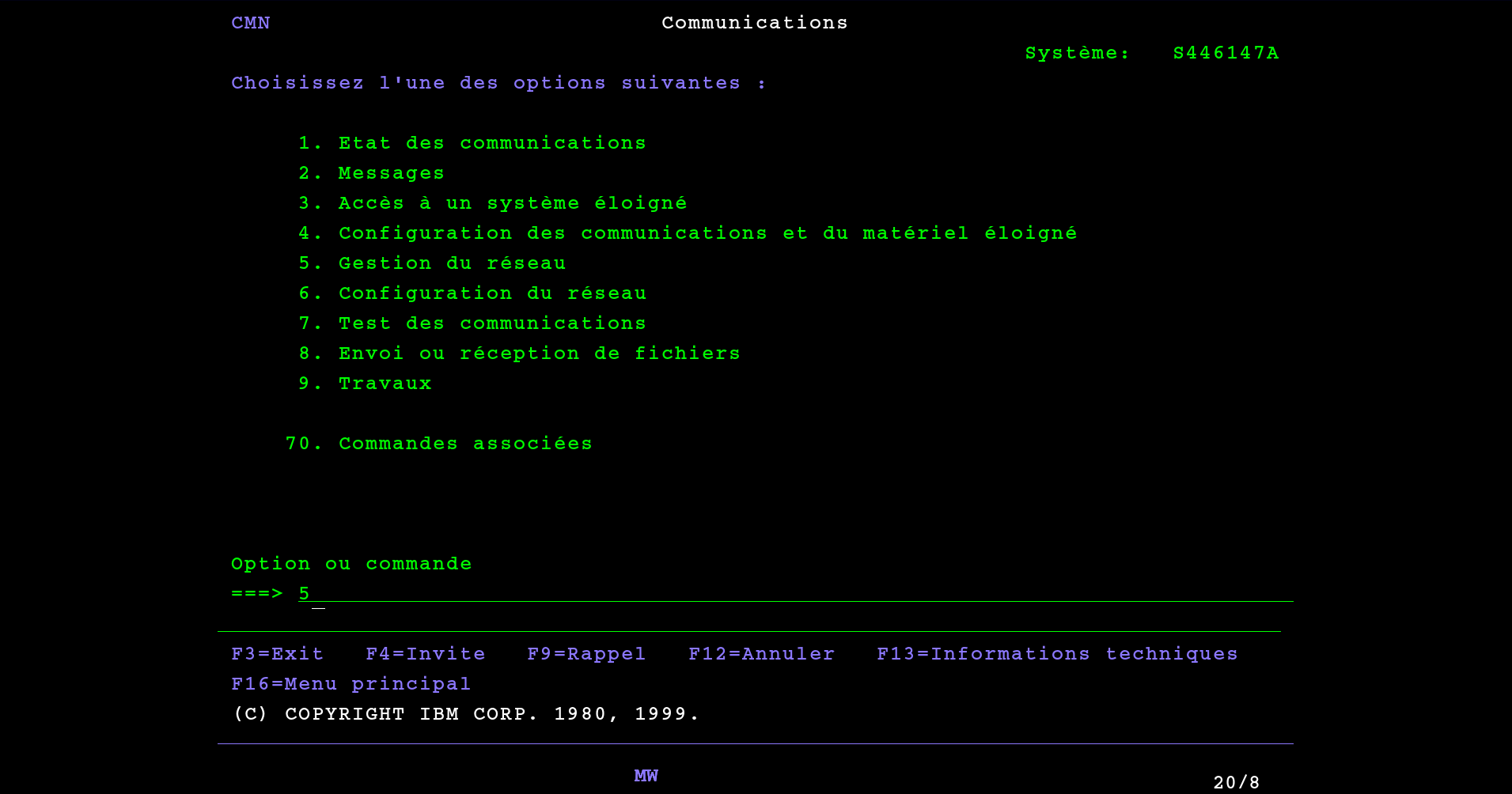 Pour configurer les interfaces TCP/IP, tapez 5 depuis le menu Communications pour arriver dans le menu 5. Gestion du réseau :