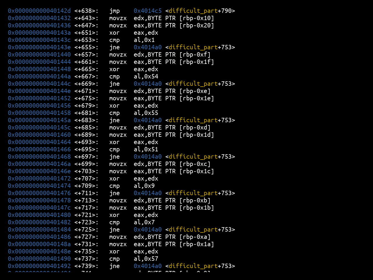 0x000000000040143e <+655>: jne 0x4014a0 <difficult_part+753>