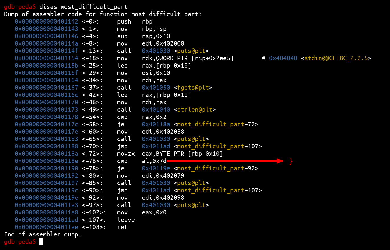 The most_difficult_part is the hardest of all this challenge (just kidding) it’s a very simple function that only checks the last character of the flag (which we can guess, it’s necessarily a} ):